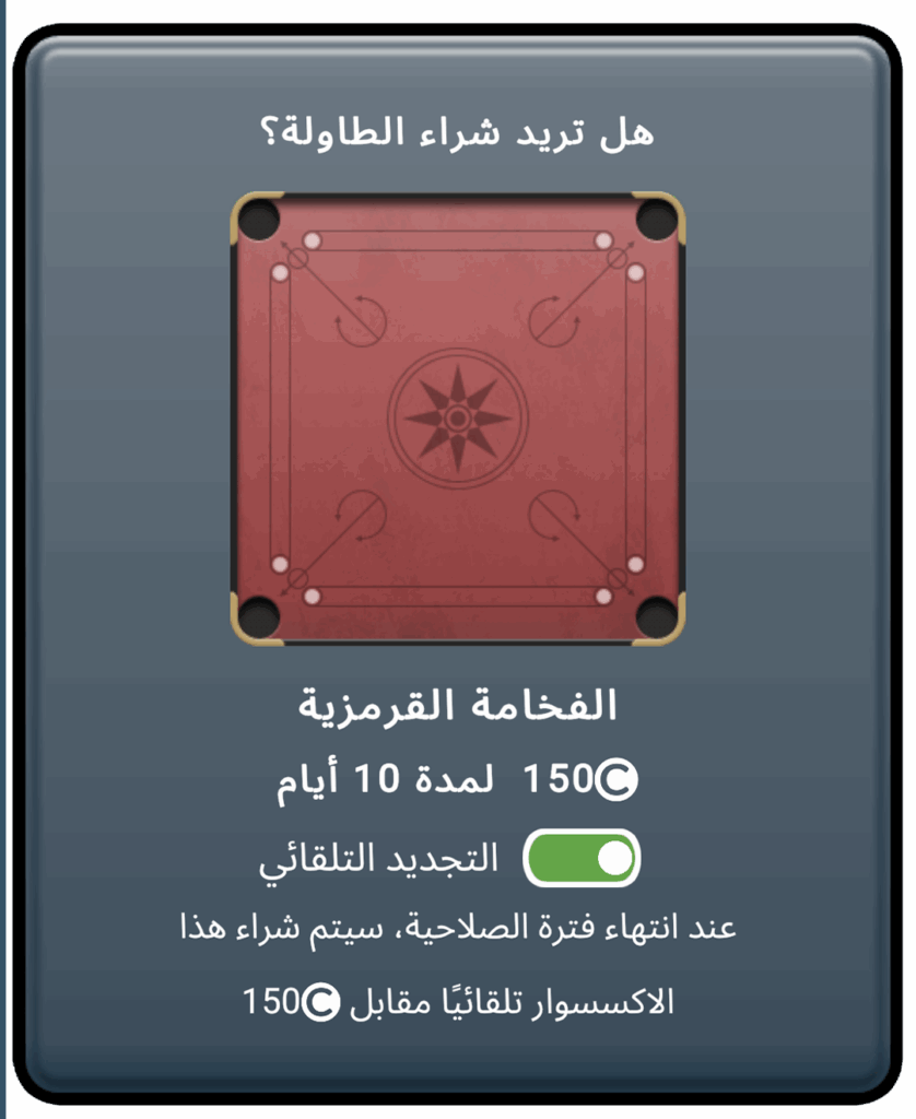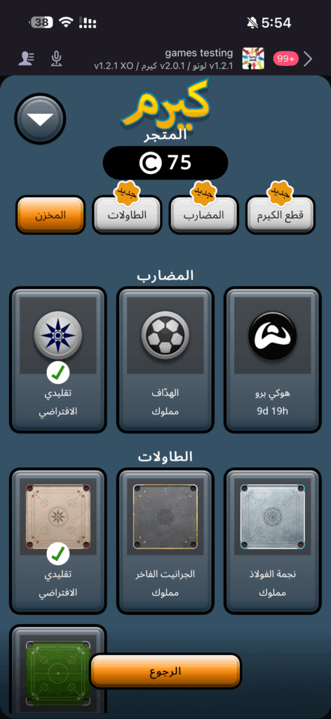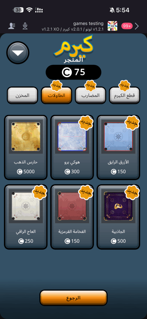 في المتجر، داخل تبويبات الطاولات والمضارب وقطع كيرم، وابحث عن التبويبات التي تحمل أيقونة جديد.