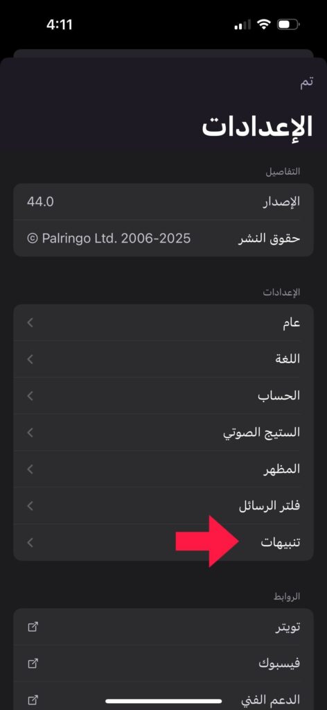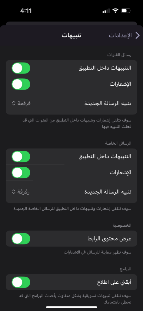 في شاشة التنبيهات، يمكنك اختيار التنبيه الذي ترغب في تفعيله عند استلام رسائل خاصة، رسائل القنوات، خصوصية عرض محتوى الروابط بالتنبيهات، تنبيهات البرامج.