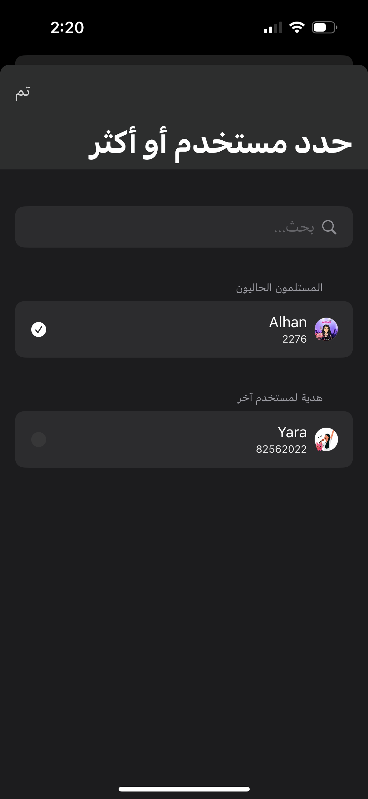 -اختر الحساب الذي ترغب بترقيته إلى حساب مميز (يمكنك اختيار أكثر من حساب إذا كنت تمتلك الصلاحية)، ويمكنك أيضاً ترقية حساب صديقك كهدية منر خلال “هدية لمستخدم آخر” كما موضح بالصورة ادناه.