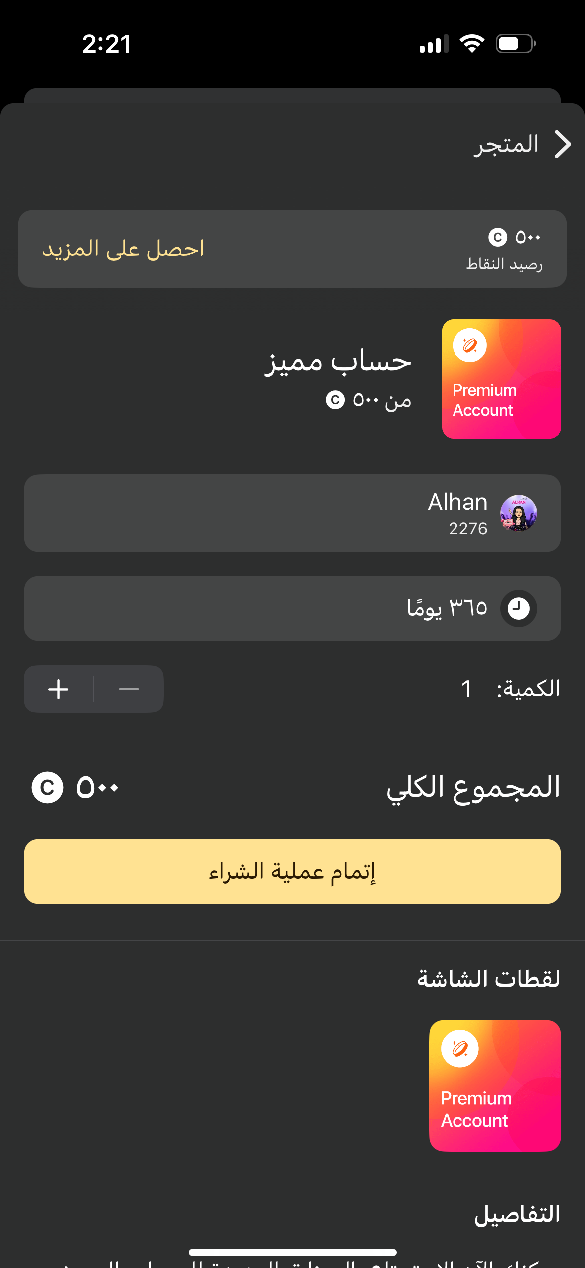 بعد اختيار الحساب والمدة، اضغط على “إتمام عملية الشراء”.
